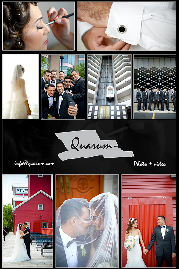 Quarum has the pleasure of capturing this great looking couple at a very modern and sleek looking hotel located just north of Toronto. Then heading to and old red barn location for some more artsy shots. The vibrant red colours from the walls gave off a very rustic contrast making the bride + groom pop. The open shaft on the elevator makes for a very unique photo as the bride was coming down the elevator the groom was waiting downstairs for the first reveal.